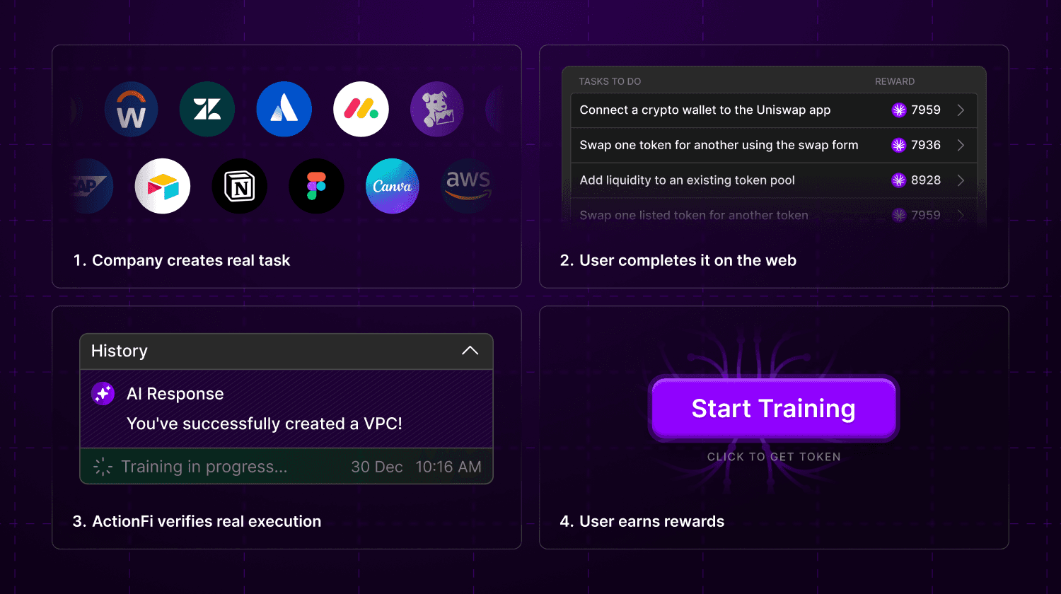 ActionFi was built to fix this. Using Action Model’s browser extension and execution layer, ActionFi can directly observe whether a task actually occurred on any website - no APIs, SDKs, or custom integrations required.